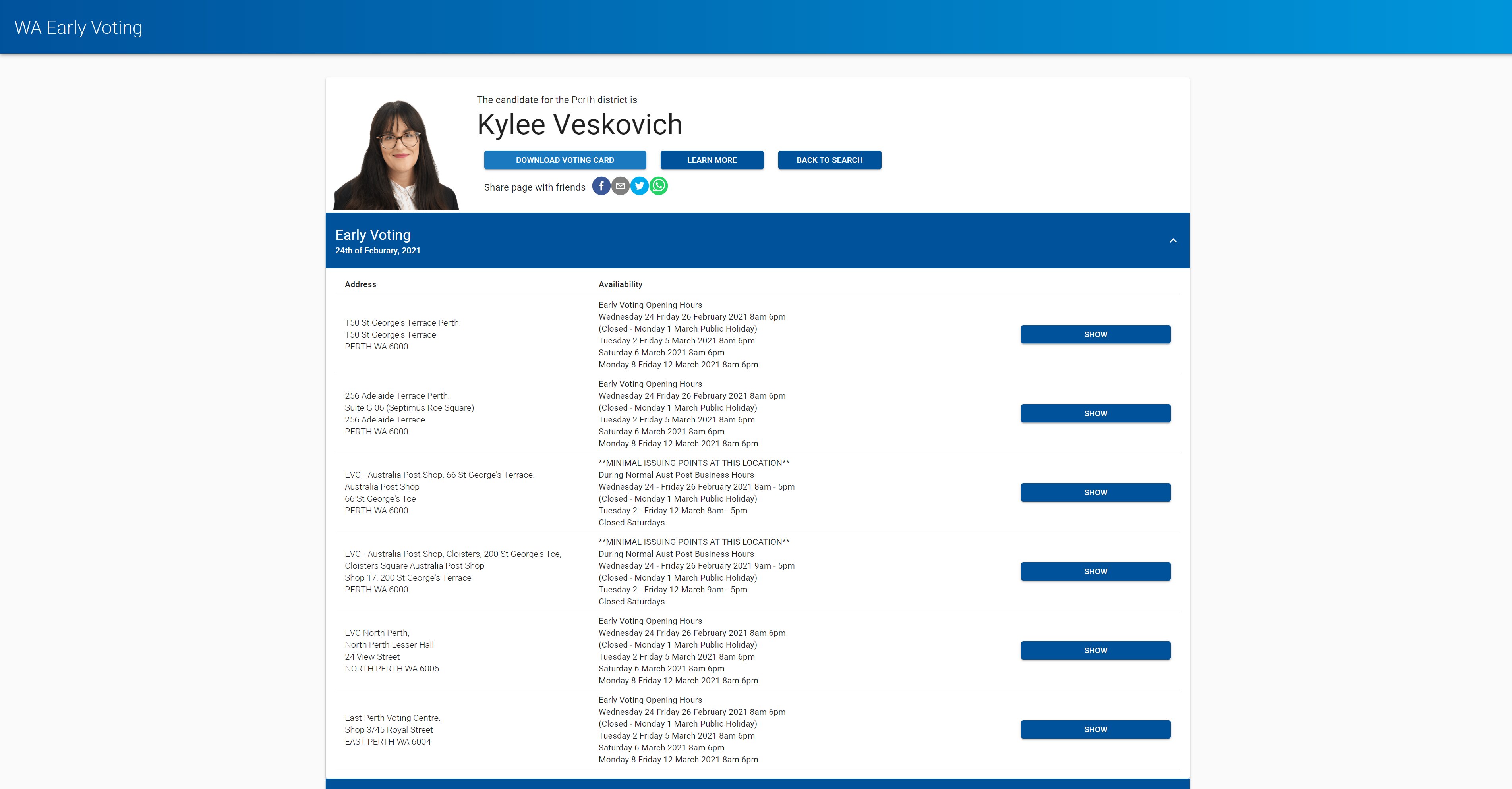 Similarly, the WhereCanIVote.org.au website asks users to enter their postcode, which it uses to display their Liberal candidate, as well as polling places open before and on election day.