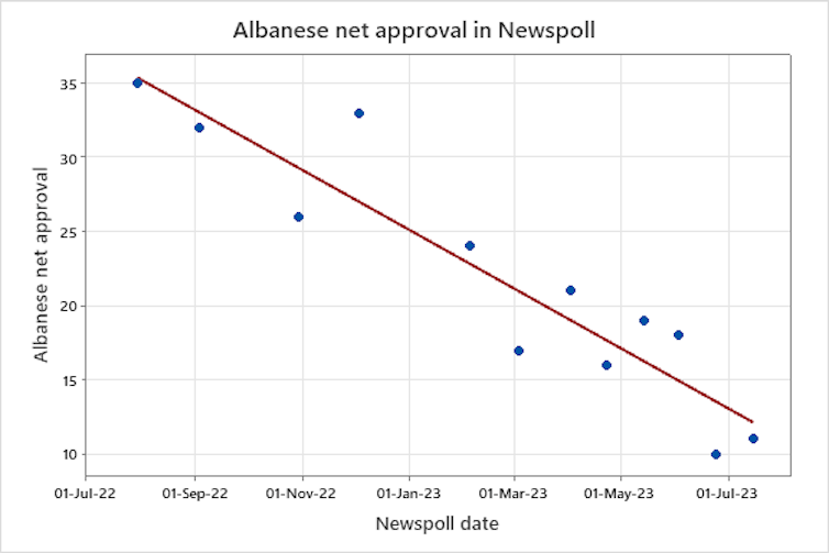 The graph below shows Albanese’s net approval in Newspoll since the first Newspoll of this term in July 2022. Newspoll data is from The Poll Bludger’s BludgerTrack. Points on the graph are individual poll results, with a trend line fitted using the statistical software Minitab.