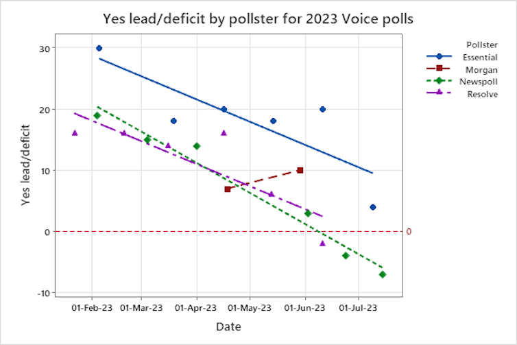 Support for the Indigenous Voice to parliament dropped again in Newspoll, with “no” to the Voice now ahead by 48–41, from a 47–43 “no” lead three weeks ago. Here is an updated version of the 2023 Voice polls by pollster graph that I first published last week.