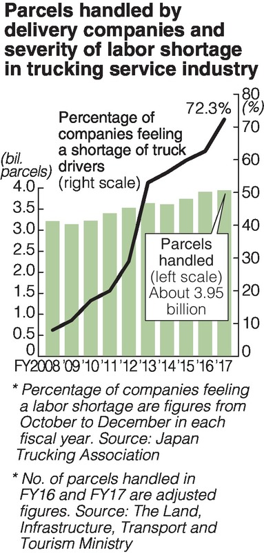 According to the Land, Infrastructure, Transport and Tourism Ministry, due to the expansion of internet shopping, the total number of units handled by delivery services in fiscal 2017 was roughly 3.95 billion, a 1.1 percent increase on the previous year. However, the number of cases in which the intended recipients of packages are not at home has increased, due to the rise in situations such as both partners in a couple working. Consequently, more than 15 percent of packages handled by major delivery companies need to be redelivered. Amid calls for work style reform, it is difficult to ask employees to take on even more work than they currently face.
