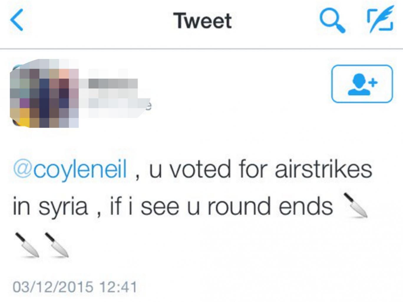 Mr Coyle received a tweet shortly before 1pm today, which has since been deleted, reading: “U voted for airstrikes in Syria, if I see you round ends (sic).”