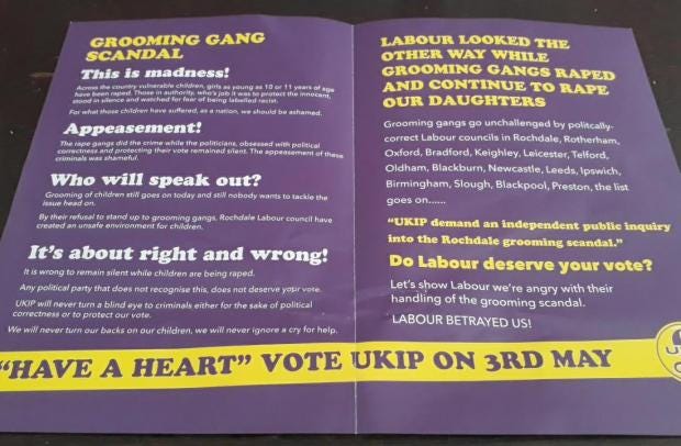 A leaflet distributed by the party ahead of local elections on Thursday claimed "politically-correct" Labour councils had "looked the other way" while grooming gangs "raped our daughters".