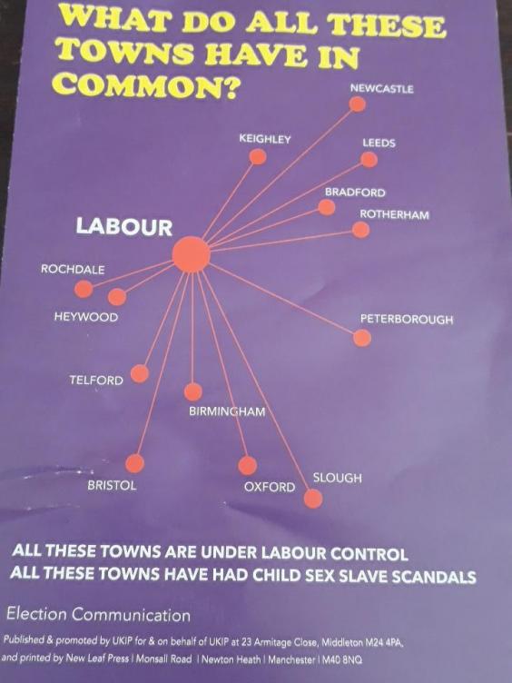 The Ukip leaflet given to residents in Rochdale claimed Labour councils had turned a blind eye to the sexual abuse of children.
