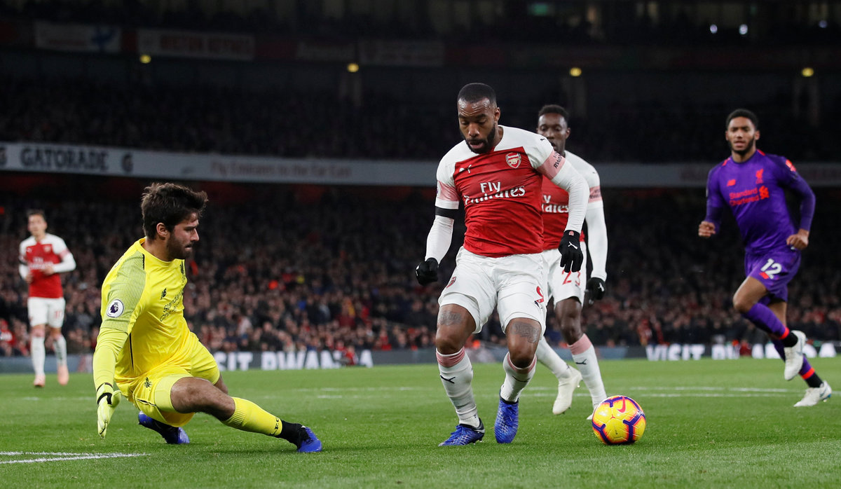 Soccer Football - Premier League - Arsenal v Liverpool - Emirates Stadium, London, Britain - November 3, 2018 Arsenal's Alexandre Lacazette shoots at goal under pressure from Liverpool's Andrew Robertson Action Images via Reuters/Matthew Childs