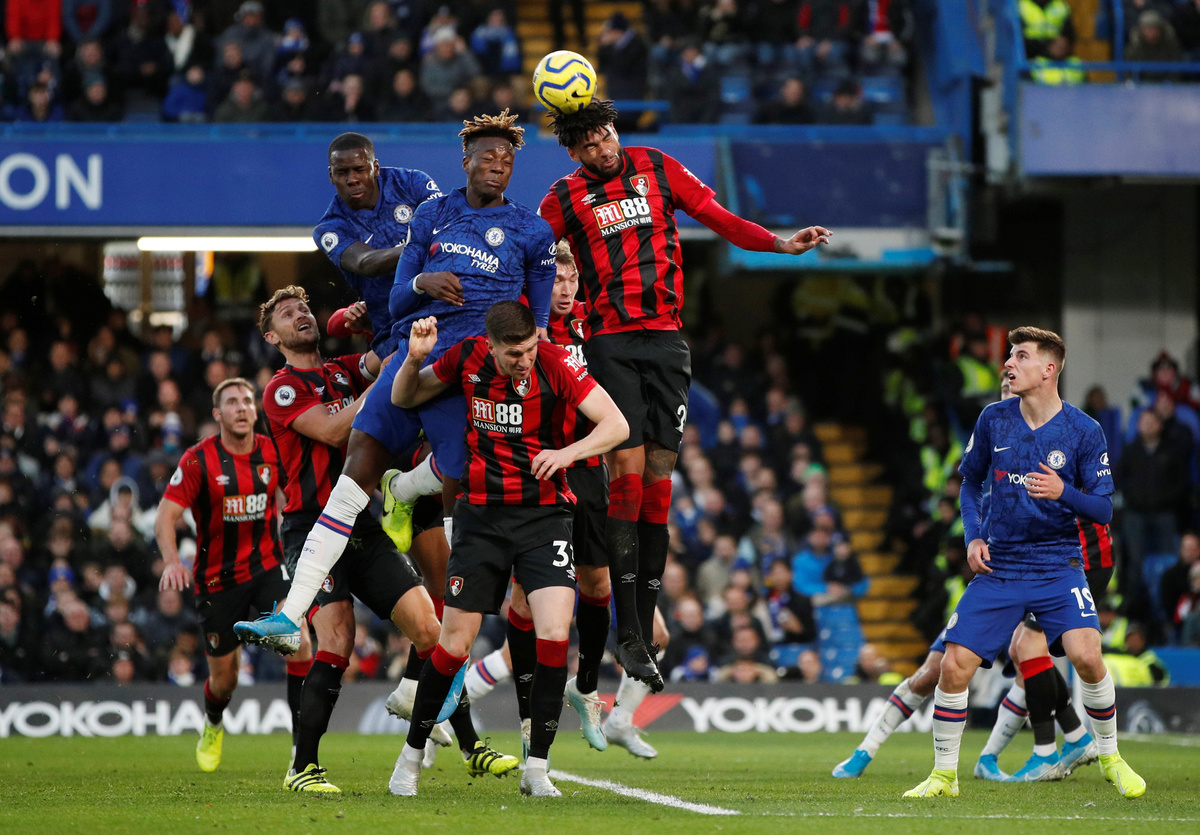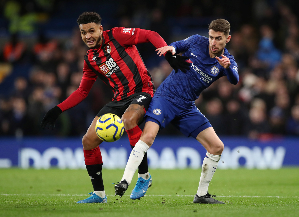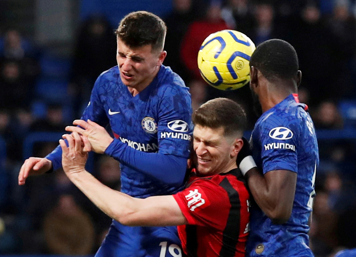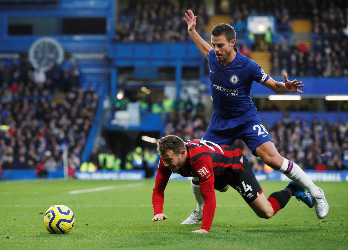Soccer Football - Premier League - Chelsea v AFC Bournemouth - Stamford Bridge, London, Britain - December 14, 2019 Chelsea's Jorginho in action with Bournemouth's Joshua King REUTERS/David Klein Soccer Football - Premier League - Chelsea v AFC Bournemouth - Stamford Bridge, London, Britain - December 14, 2019 Chelsea's Antonio Rudiger and Mason Mount in action with Bournemouth's Chris Mepham REUTERS/David KleinSoccer Football - Premier League - Chelsea v AFC Bournemouth - Stamford Bridge, London, Britain - December 14, 2019 Chelsea's Tammy Abraham and Kurt Zouma in action with Bournemouth's Philip Billing and Chris Mepham Action Images via Reuters/John Sibley Soccer Football - Premier League - Chelsea v AFC Bournemouth - Stamford Bridge, London, Britain - December 14, 2019 Chelsea's Cesar Azpilicueta in action with Bournemouth's Ryan Fraser REUTERS/David Klein Soccer Football - Premier League - Chelsea v AFC Bournemouth - Stamford Bridge, London, Britain - December 14, 2019 Chelsea's Kepa Arrizabalaga and Antonio Rudiger in action with Bournemouth's Philip Billing REUTERS/David Klein