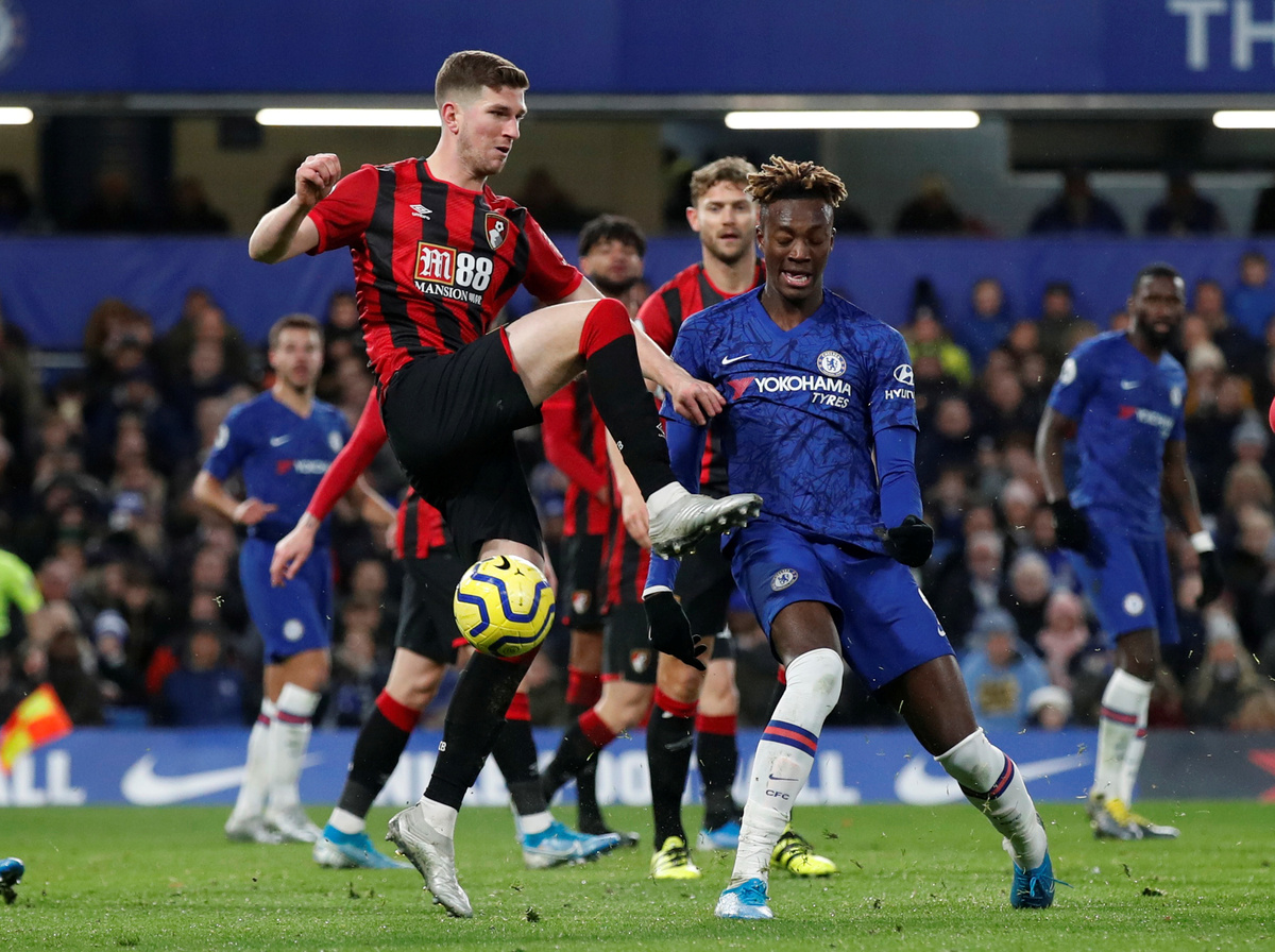 Soccer Football - Premier League - Chelsea v AFC Bournemouth - Stamford Bridge, London, Britain - December 14, 2019 Bournemouth's Chris Mepham in action with Chelsea's Tammy Abraham REUTERS/David Klein