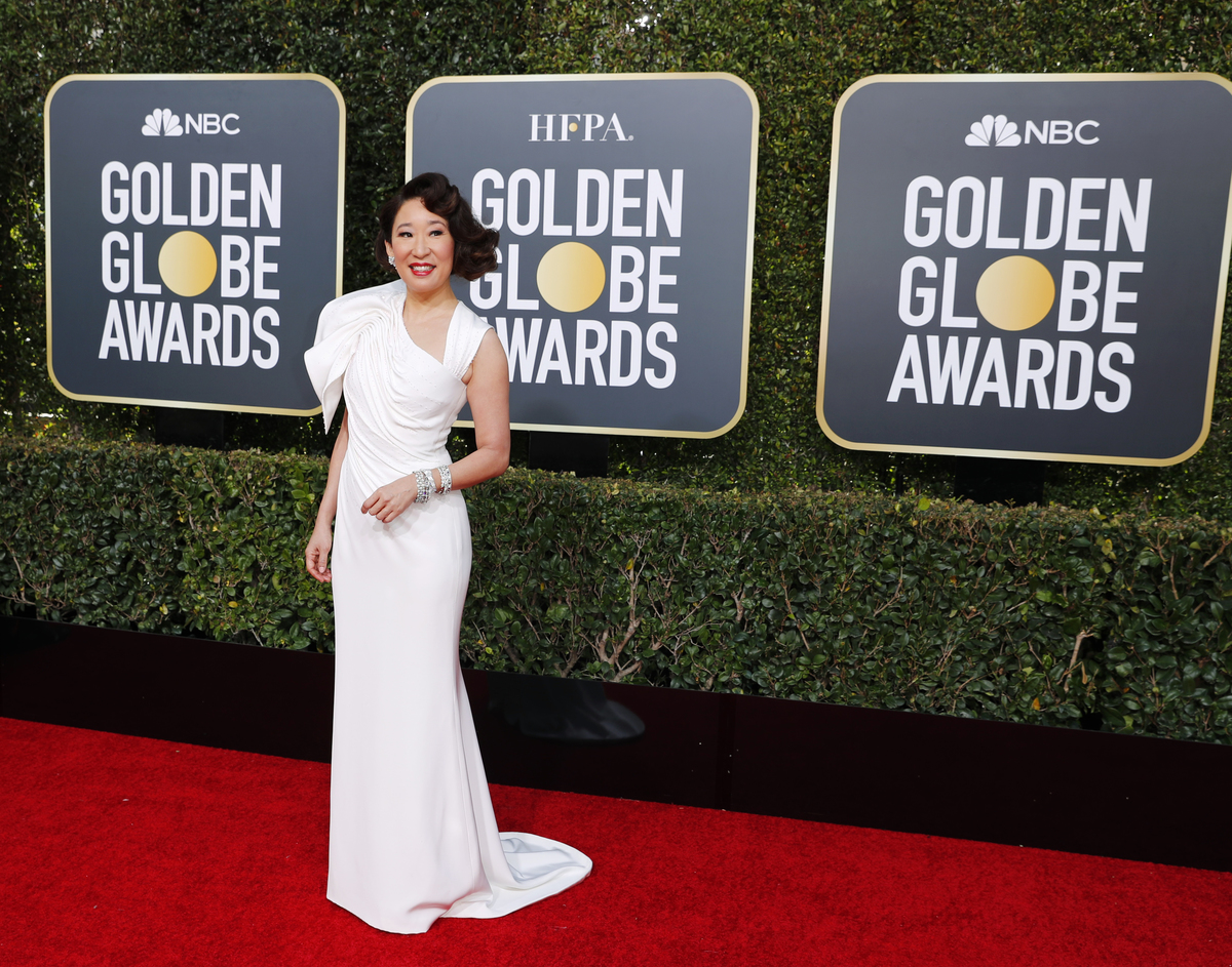 "Killing Eve" star and co-host of the ceremony Sandra Oh donned a long white gown, while People magazine's "sexiest man alive" Idris Elba chose a dark green and black tuxedo.
