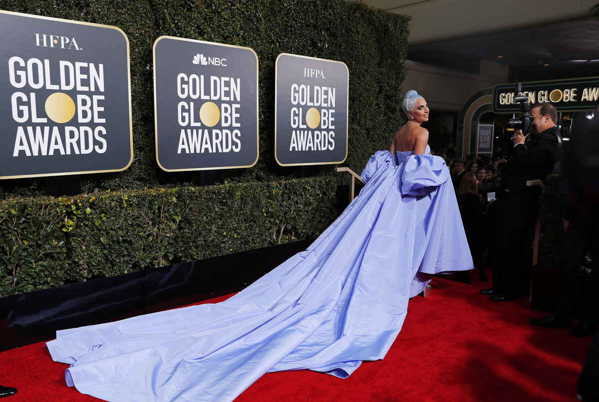 Lady Gaga, the front-runner for a best drama actress award for "A Star Is Born," graced the red carpet in a Valentino lavender gown with puffed sleeves and a long train, with her blue-dyed hair pulled into a tight bun, and wearing a stunning Tiffany's diamond necklace.