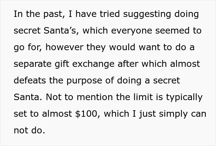 No wonder the woman is experiencing a financial crisis—and she’s a single mother. In the past, she has tried to come up with an alternative, like Secret Santa, but they wanted to do a gift exchange later on which didn’t really work for her.