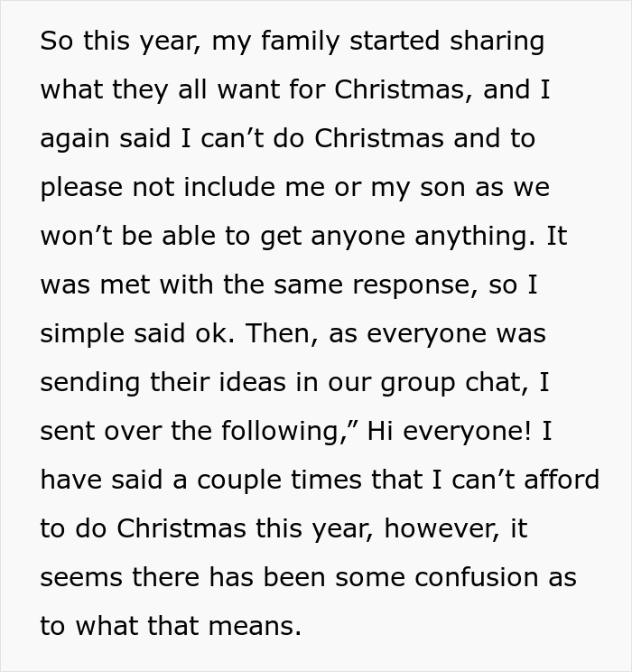 In today’s story, the original poster (OP) is the mom of a 4-year-old boy, and she just got her first apartment after saving for four years while working three jobs. Wow, what a determined young lady! Although her hard work finally paid off, she’s now in a pretty tight spot and can’t really afford to buy Christmas presents for her almost 40 close relatives like every other year.