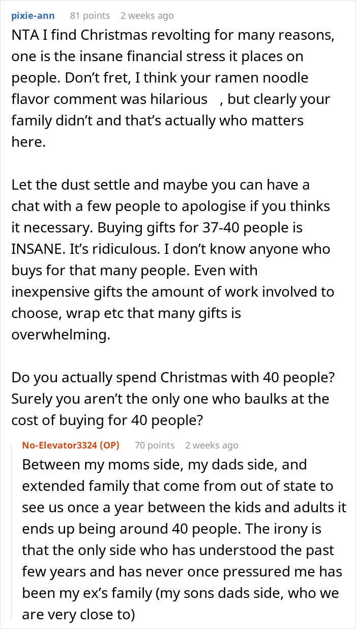Speaking of Christmas gifts, Reddit user No-Elevator3324 simply can’t afford to give them to almost 40 of her relatives this year as she is struggling with a financial crisis. However, they were deaf to her protests, so she said she would gift everyone ramen noodles, which irked them like crazy.