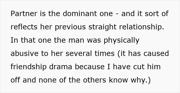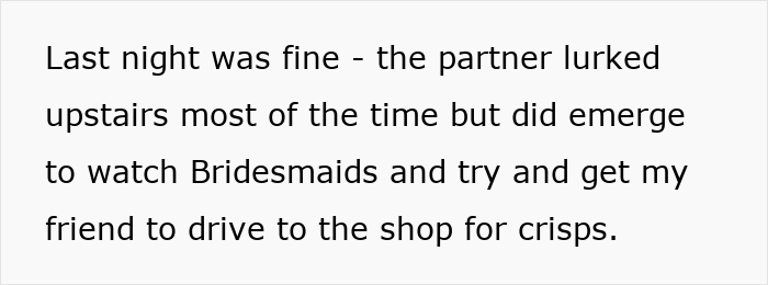 In updates to her original post, OP said the previous evening had been uneventful, with the partner mostly lurking upstairs, emerging only to watch a TV show. OP admits to thinking her friend lived a more idyllic life than she does, but that she has a bad feeling about the partner, so she’s going to try and stay in touch with her more often in future.