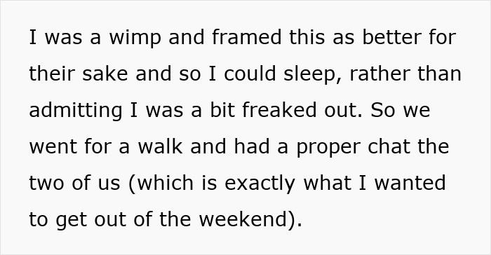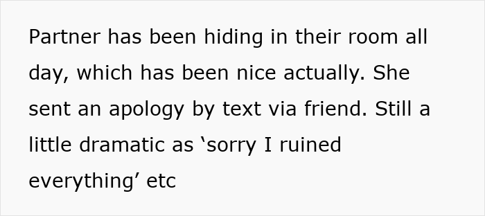 By morning, though, apologies were flying and tears had dried. The friend admitted her relationship was rocky and begged OP not to leave. They salvaged some calm by walking and talking, which was what OP had been hoping for anyway. Meanwhile, the partner hid upstairs, texting dramatic apologies like “Sorry I ruined everything.”