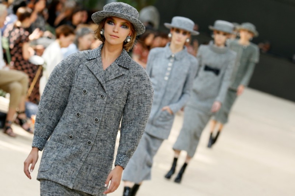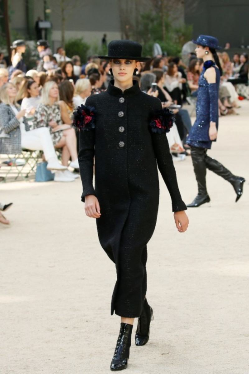 Models paraded in demure A-line skirts, hooded coats and wide-legged jumpsuits in classic Chanel tweed.