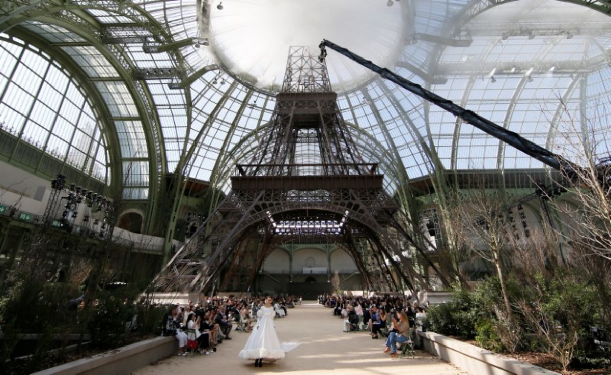 This season it was back to basics with the mock-up tower straddling a catwalk inside the Grand Palais.