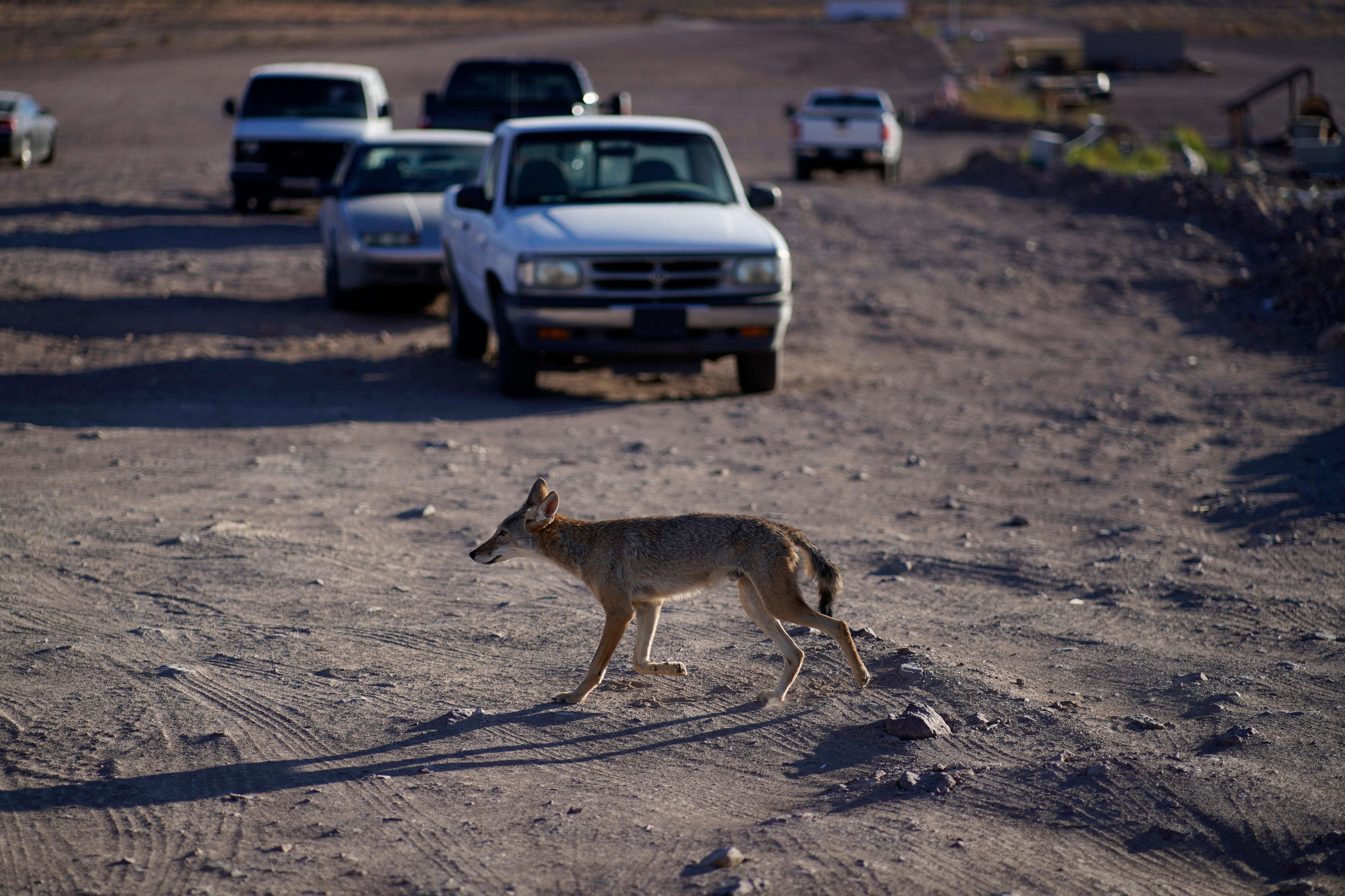 As the Sun sets to the west over Las Vegas, the light illuminates the translucent hollowed-out body and empty eye socket of one fish. Its mouth is open as if it is trying to breathe.