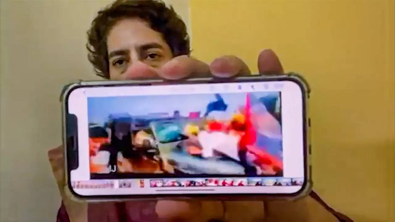 Priyanka shows the video to the camera and says, "This video shows the son of a minister in your government crushing farmers under the wheels. Have a look at this video and tell the country the reasons for not dismissing this minister from your government and for not arresting his son."