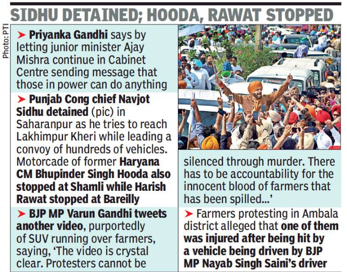 DGP Mukul Goel told TOI, “A nine-member committee headed by a DIG-rank officer has been formed to ensure an impartial and transparent probe into the Lakhimpur Kheri incident … I sincerely hope that the committee will ensure probity and help expedite the probe as soon as possible.” The reason, IG Singh told TOI, is that the “ambit of the case has turned vast,” adding, “An ASP-rank officer posted in the district was supervising the probe but now this monitoring committee will oversee the probe.”