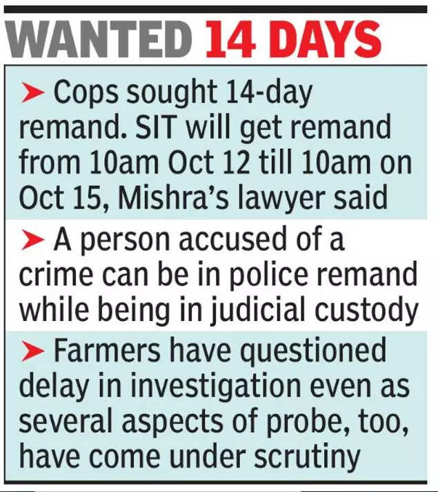 Protesting farmers, on the basis of whose complaint Ashish was booked, have said he was in one of the vehicles that ran over farmers on the day of the violence. Both Ashish and his father have denied this, maintaining that he was not at Banbirpur at the time of the killings. During the 12-hour questioning at Lakhimpur Kheri crime branch office on Saturday, however, he could not explain where he was between 2.36pm and 4pm, a member of the SIT investigating the violence had told TOI. The violence took place around 3pm. He had been sent to 14-day judicial custody on Sunday and sent to Lakhimpur district jail. Police, then, wanted remand to be able to question him.