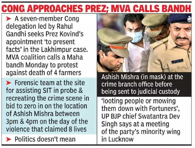 Ashish had claimed that the SUV which mowed down farmers was driven by his driver Hari Om Mishra and that he was not in it. “During questioning, Ashish said he was at a wrestling event in Banbirpur village, 4 km from where the incident took place, and left the spot later to visit a rice mill. But he was not able to give satisfactory answers when he was asked about his location between 2.36pm and 4pm,” a member of the SIT team told TOI. The Lakhimpur incident took place at about 3.03pm.