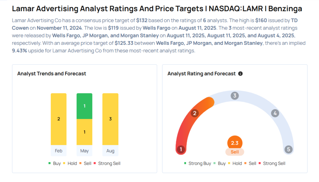 - JP Morgan analyst David Karnovsky maintained Lamar Advertising with a Neutral and lowered the price target from $125 to $122.