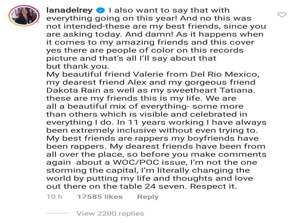 In a comment under the announcement, Del Rey quickly launched a defence of the cover and the women depicted in it. It is unclear what prompted the defence, though Del Rey implied that she had received criticism about a perceived absence of women of colour in the image.