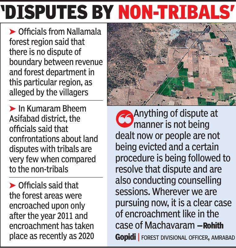The officials said that the forest areas were encroached upon only after 2011 and encroachment has taken place as recently as 2020. “Anything of dispute at manner is not being dealt now or people are not being evicted and a certain procedure is being followed to resolve that dispute and are also conducting counselling sessions. Wherever we are pursuing now, it is a clear case of encroachment like in the case of Machavaram,” said Rohith Gopidi, forest divisional officer, Amrabad.