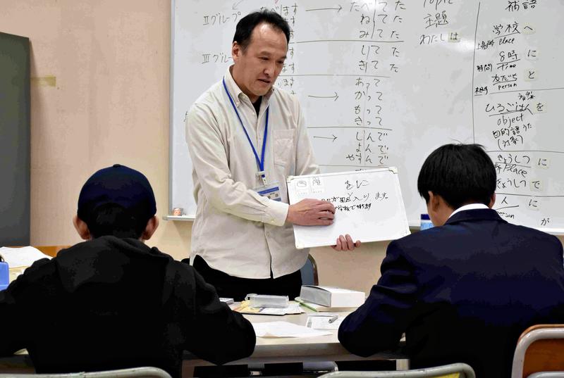 In a classroom at Yokohama Commercial High School on Feb. 1, one of the five locations for such classes in the city, instructor Toshio Shatani, 55, had two male junior high school students -- one from the Philippines and another from China -- write short sentences using Japanese that they had already learned.