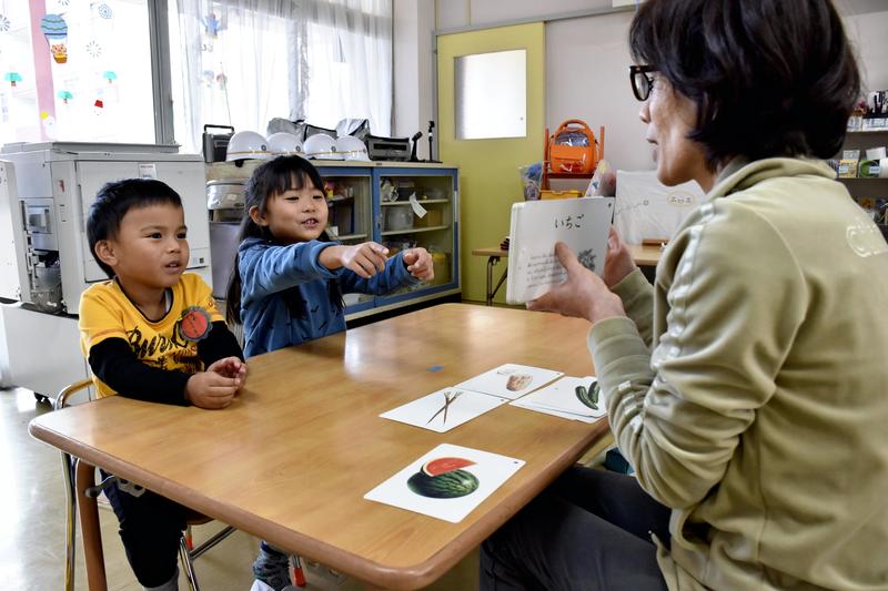 At the municipal Shin-Kanie-Kita nursery school in Kanie, a town adjacent to Nagoya, two children whose parents are foreigners were being shown flashcards that featured illustrations of vegetables and fruits.