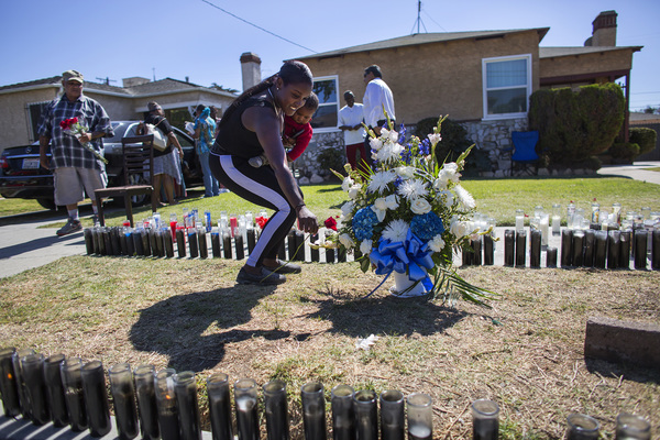 Graffiti covered buildings near the intersection. "Rest well Carnell," one message read. "LAPD" was written next to his name, the letters crossed out with an X.