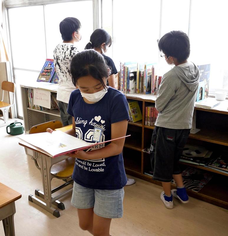 On June 24, 35 pupils of the school's 5th grade, class 3, went to the conventional library and the second library to borrow books. Shino Hasebe, 10, who borrowed three books, said with a smile: "I could finally borrow the next books in a series that I had left off. It is unfortunate that we cannot come to the library freely, but I'm happy that the number of books we can borrow has increased."