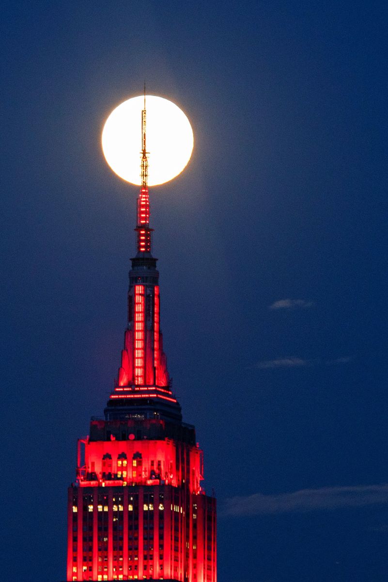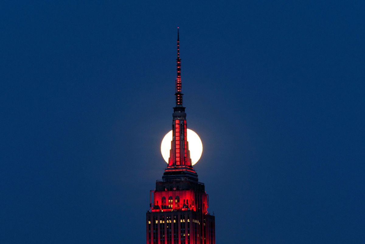 The Supermoon rises behind the Empire State Building while it glows red in solidarity with those infected with coronavirus as the outbreak of the disease (COVID-19) continues in the Manhattan borough of New York City, as it is seen from Hoboken, New Jersey, U.S., April 7, 2020. REUTERS/Eduardo Munoz TPX IMAGES OF THE DAY