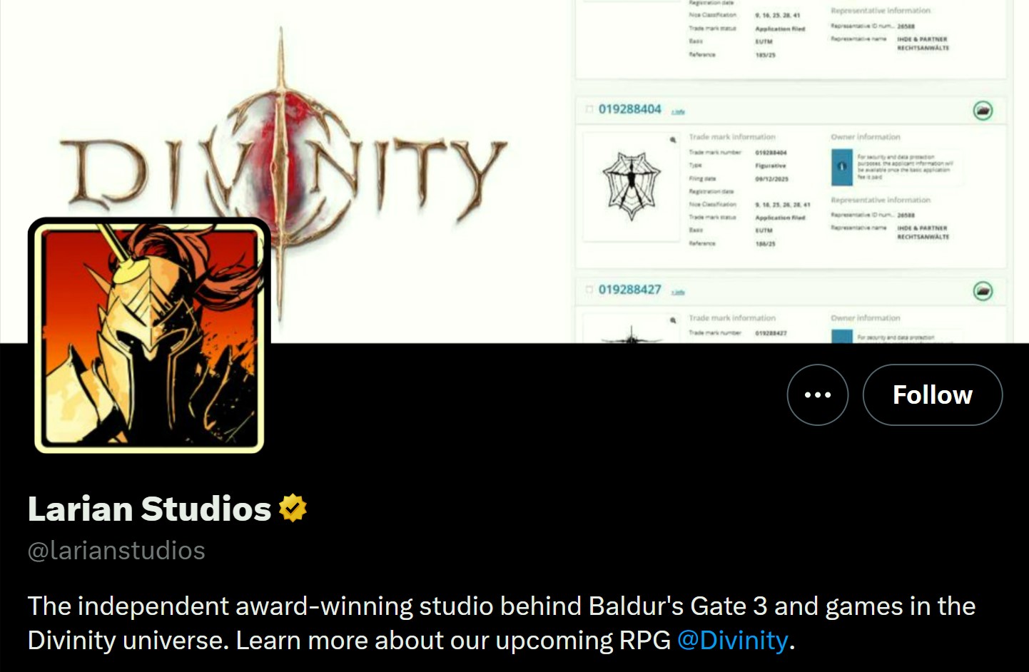 At some point following The Game Awards, people started noticing that the team seemed to be poking fun at itself. Take the official Larian Twitter account as an example, whose header image is now a screenshot of the trademark application that tipped fans off to Divinity's existence. The same is true of the Larian Bluesky account.