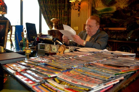 The unsubtle décor continued inside, with green-and-gold carpeting and an ornate painting depicting the Virgin Mary rising displayed outside his office door. Before entering, I’d been instructed by his publicist to speak loudly and clearly and not to ask any stupid questions (that last bit inspired me to leave the birthday props behind.) I was also given the proper greeting protocol: go around the right side of Flynt’s desk and shake his hand.
