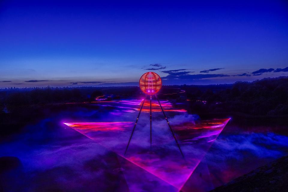 Houghton Hall in Norfolk has been transformed and illuminated by 528 Hz Love Frequency, a major solo exhibition of laser and LED installations by British artist, Chris Levine. Marking the inaugural winter show in the historic grounds of the former home of Sir Robert Walpole, the first British Prime Minister, this exhibition runs until 23 December 2021. The centerpiece of the exhibition is Molecule of Light, a spectacular six ton, 25 meter high sculpture on the front lawn, which comes to life as darkness falls, projecting light and sound all around it. The exhibition also includes a series of new holographic artworks, prints and immersive laser and LED installations.