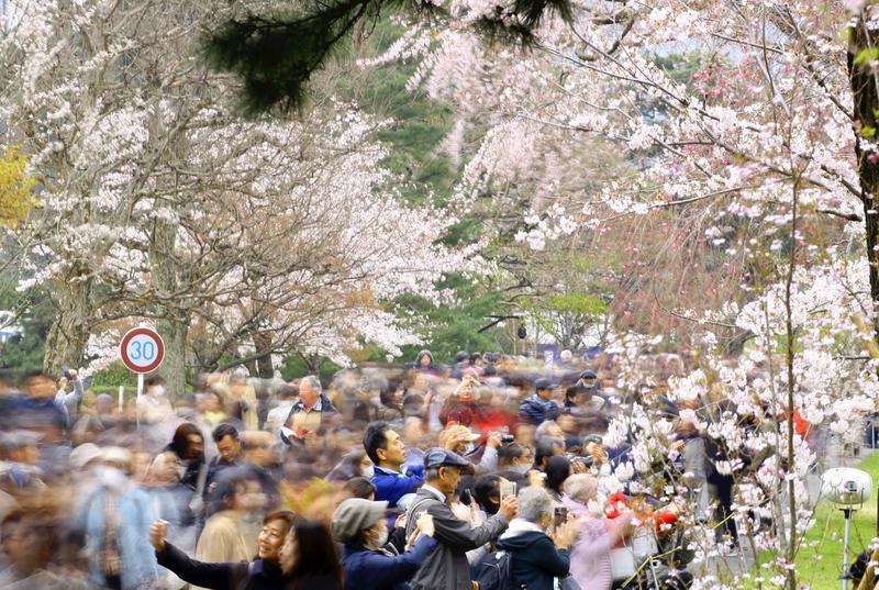 A crowd of visitors enjoy looking at cherry blossoms along Inui Street at the Imperial Palace on Saturday. A total of 103 cherry trees of 31 varieties, such as Someiyoshino and Yamazakura, are planted on both sides of the path, from which stone walls and moats of the former Edo Castle structure can be seen. The road in the palace grounds has been open to the public for periods in spring and autumn at the wish of the Emperor ever since his 80th birthday was celebrated in 2014, as he wants as many people as possible to enjoy the scenery. This is the last time in the Heisei era that the avenue is open to the public.