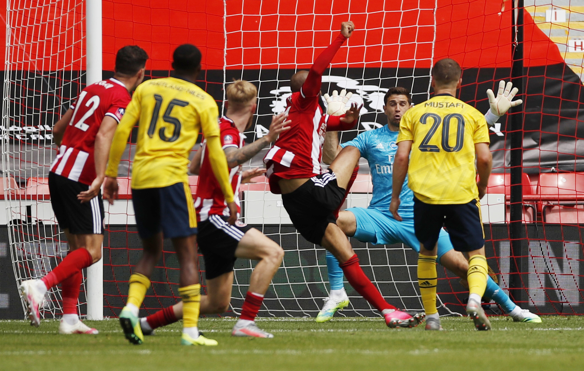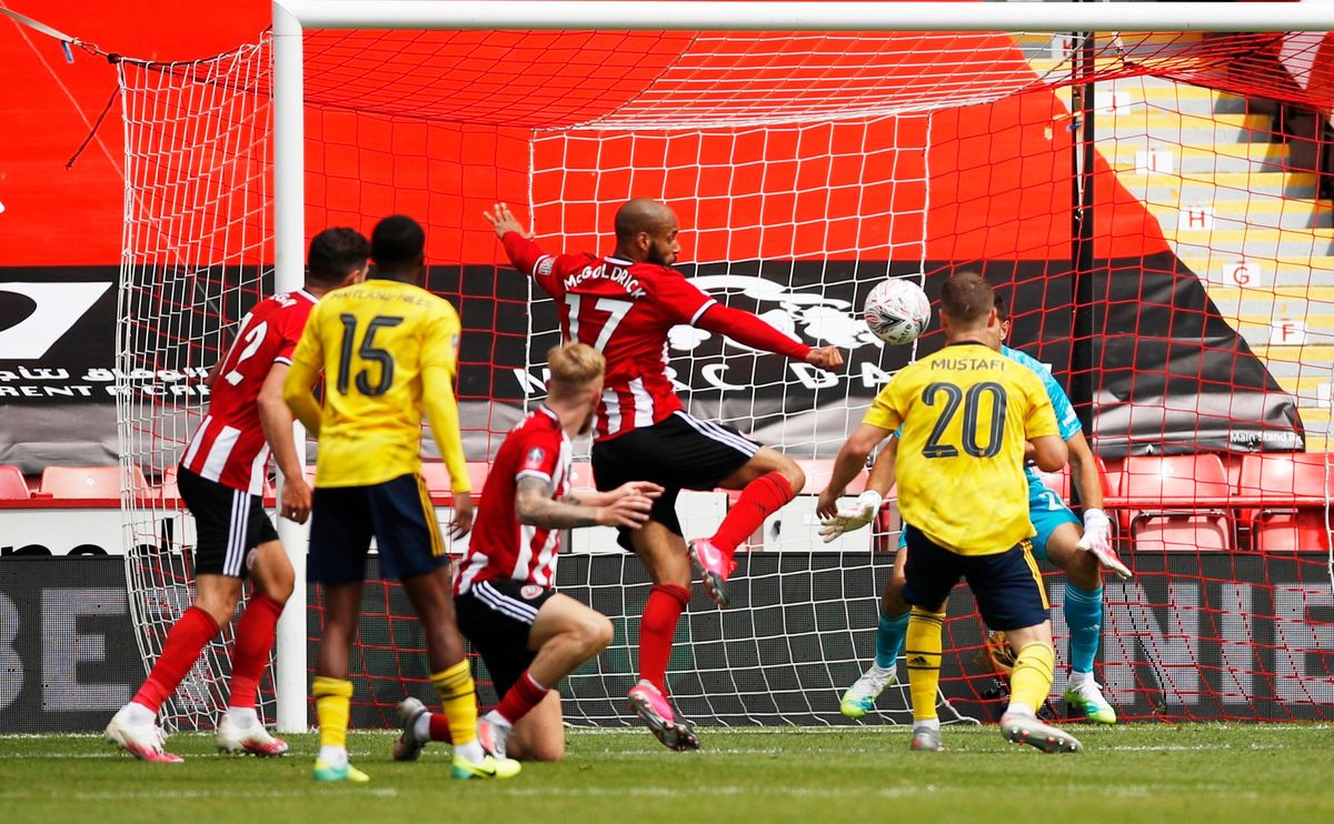 Soccer Football - FA Cup - Quarter Final - Sheffield United v Arsenal - Bramall Lane, Sheffield, Britain - June 28, 2020 Sheffield United's David McGoldrick scores their first goal, as play resumes behind closed doors following the outbreak of the coronavirus disease (COVID-19) Oli Scarff/Pool via REUTERSSoccer Football - FA Cup - Quarter Final - Sheffield United v Arsenal - Bramall Lane, Sheffield, Britain - June 28, 2020 Sheffield United's David McGoldrick scores their first goal, as play resumes behind closed doors following the outbreak of the coronavirus disease (COVID-19) Oli Scarff/Pool via REUTERSSoccer Football - FA Cup - Quarter Final - Sheffield United v Arsenal - Bramall Lane, Sheffield, Britain - June 28, 2020 Sheffield United's David McGoldrick scores their first goal, as play resumes behind closed doors following the outbreak of the coronavirus disease (COVID-19) REUTERS / Andrew Boyers / PoolSoccer Football - FA Cup - Quarter Final - Sheffield United v Arsenal - Bramall Lane, Sheffield, Britain - June 28, 2020 Sheffield United's David McGoldrick scores their first goal, as play resumes behind closed doors following the outbreak of the coronavirus disease (COVID-19) Oli Scarff/Pool via REUTERSSoccer Football - FA Cup - Quarter Final - Sheffield United v Arsenal - Bramall Lane, Sheffield, Britain - June 28, 2020 Sheffield United's Chris Basham misses a chance to score, as play resumes behind closed doors following the outbreak of the coronavirus disease (COVID-19) Oli Scarff/Pool via REUTERSSoccer Football - FA Cup - Quarter Final - Sheffield United v Arsenal - Bramall Lane, Sheffield, Britain - June 28, 2020 Sheffield United's David McGoldrick scores their first goal, as play resumes behind closed doors following the outbreak of the coronavirus disease (COVID-19) REUTERS / Andrew Boyers / PoolSoccer Football - FA Cup - Quarter Final - Sheffield United v Arsenal - Bramall Lane, Sheffield, Britain - June 28, 2020 Arsenal's Eddie Nketiah is fouled by Sheffield United's Jack Robinson, as play resumes behind closed doors following the outbreak of the coronavirus disease (COVID-19) REUTERS / Andrew Boyers / PoolSoccer Football - FA Cup - Quarter Final - Sheffield United v Arsenal - Bramall Lane, Sheffield, Britain - June 28, 2020 Sheffield United's John Egan scores a goal before it was disallowed, as play resumes behind closed doors following the outbreak of the coronavirus disease (COVID-19) Oli Scarff/Pool via REUTERS