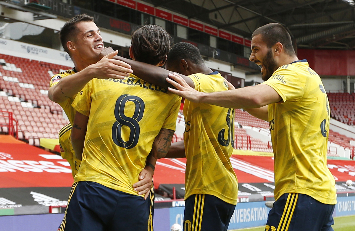 Soccer Football - FA Cup - Quarter Final - Sheffield United v Arsenal - Bramall Lane, Sheffield, Britain - June 28, 2020 Arsenal's Dani Ceballos celebrates scoring their second goal with teammates, as play resumes behind closed doors following the outbreak of the coronavirus disease (COVID-19) REUTERS / Andrew Boyers / Pool
