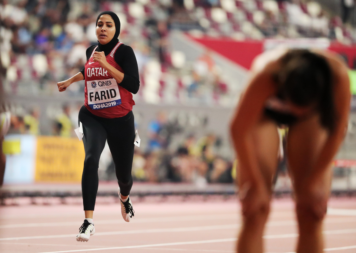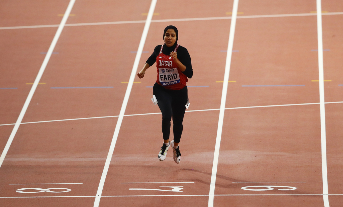 Competing in a black full-body leotard covering her from head to toe under a national team singlet, Farid is one of two female athletes from Qatar taking part in the world athletics championships for the first time.