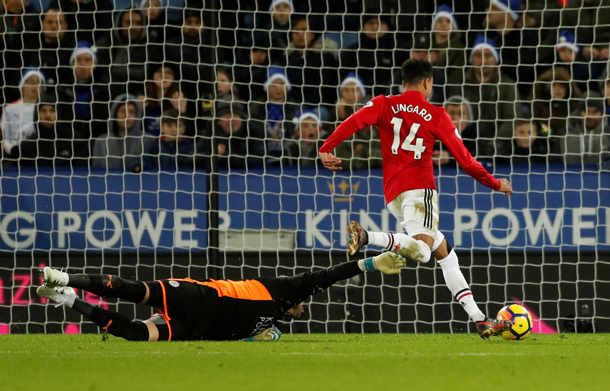 Soccer Football - Premier League - Leicester City vs Manchester United - King Power Stadium, Leicester, Britain - December 23, 2017 Manchester United's Jesse Lingard in action with Leicester City's Kasper Schmeichel before hitting the post Action Images via Reuters/Andrew Boyers