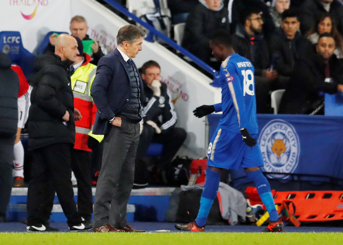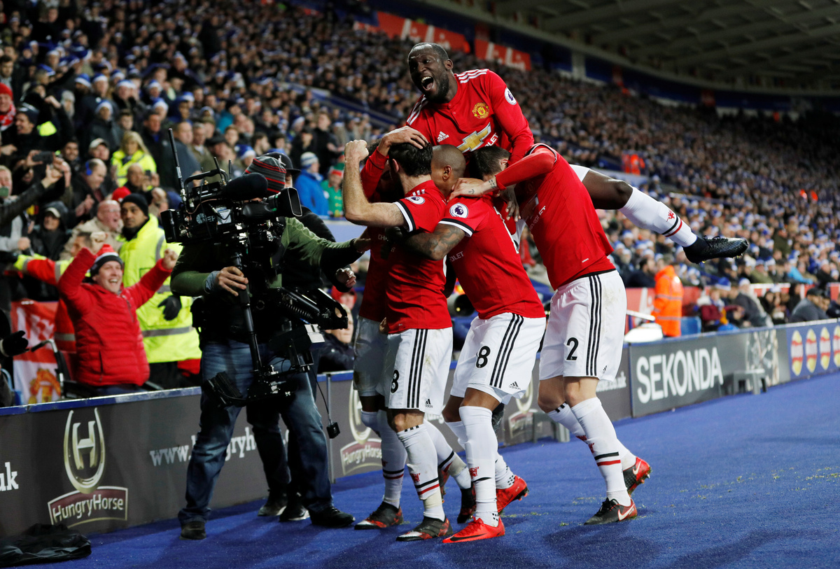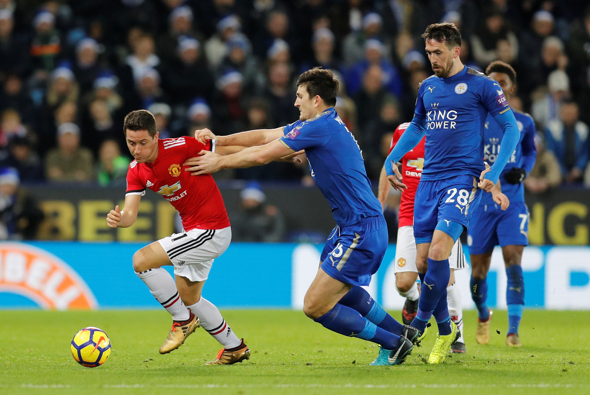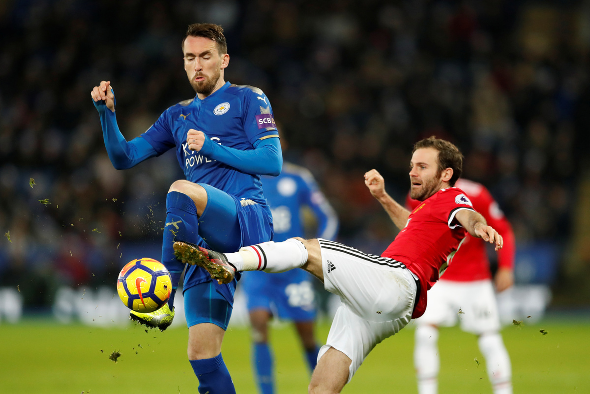 Soccer Football - Premier League - Leicester City vs Manchester United - King Power Stadium, Leicester, Britain - December 23, 2017 Manchester United's Ander Herrera in action with Leicester City's Harry Maguire REUTERS/Darren Staples Soccer Football - Premier League - Leicester City vs Manchester United - King Power Stadium, Leicester, Britain - December 23, 2017 Leicester City's Daniel Amartey is sent off as Leicester City manager Claude Puel looks on Action Images via Reuters/Andrew Boyers Soccer Football - Premier League - Leicester City vs Manchester United - King Power Stadium, Leicester, Britain - December 23, 2017 Leicester City's Wes Morgan looks dejected after Manchester United's second goal Action Images via Reuters/Andrew Boyers Soccer Football - Premier League - Leicester City vs Manchester United - King Power Stadium, Leicester, Britain - December 23, 2017 Manchester United's Juan Mata celebrates scoring their second goal with team mates REUTERS/Darren Staples Soccer Football - Premier League - Leicester City vs Manchester United - King Power Stadium, Leicester, Britain - December 23, 2017 Manchester United's Nemanja Matic in action with Leicester City's Jamie Vardy Action Images via Reuters/Andrew Boyers Soccer Football - Premier League - Leicester City vs Manchester United - King Power Stadium, Leicester, Britain - December 23, 2017 Leicester City's Christian Fuchs in action with Manchester United's Juan Mata Action Images via Reuters/Andrew Boyers