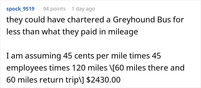 Bored Panda was curious about how the OP came up with the idea to cancel the carpool in the first place. “My idea to protest by stopping the carpool came to me immediately. I was really angry that the managers were so inconsiderate, and I wanted to make a statement. The company was very focused on profits, and I hit them where it hurt. For years, we carpooled to training, and the company took it for granted,” redditor u/MagicManicPanic shared with Bored Panda.