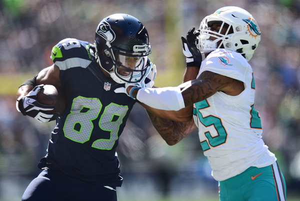 With 2:02 remaining, Wilson found Baldwin for 22 yards to pick up a fourth-and-four, moving the ball to the Miami 31. The play came after Seattle had taken its second timeout during which the Seahawks decided to change formations. Baldwin came out of the slot to break open on a crossing route.
