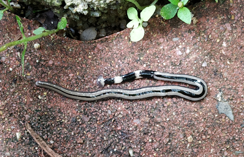 It was about 10 cm long and looked like a worm. It also had stark stripey warning colours and for a moment almost looked like a tiny juvenile snake. However, when looking at the head – hammerheaded and flattened and apparently eyeless – it was clearly something different.