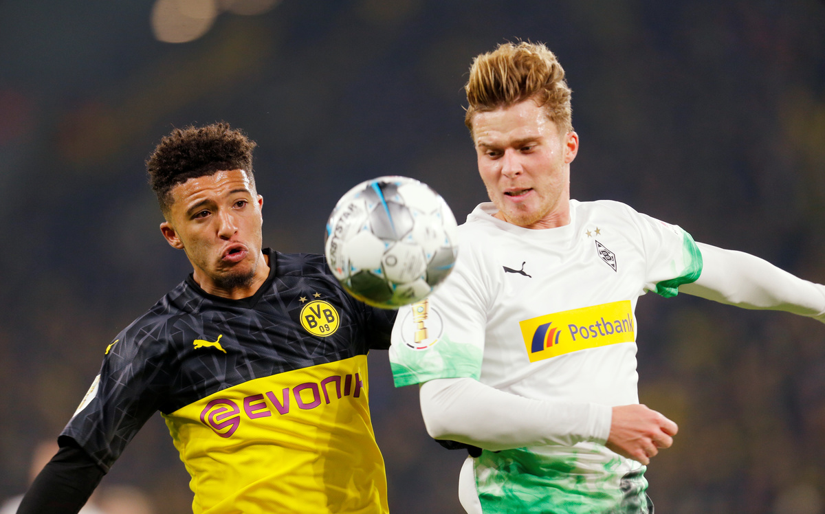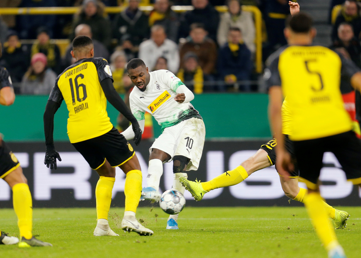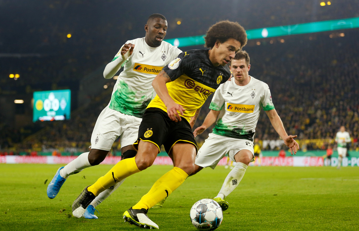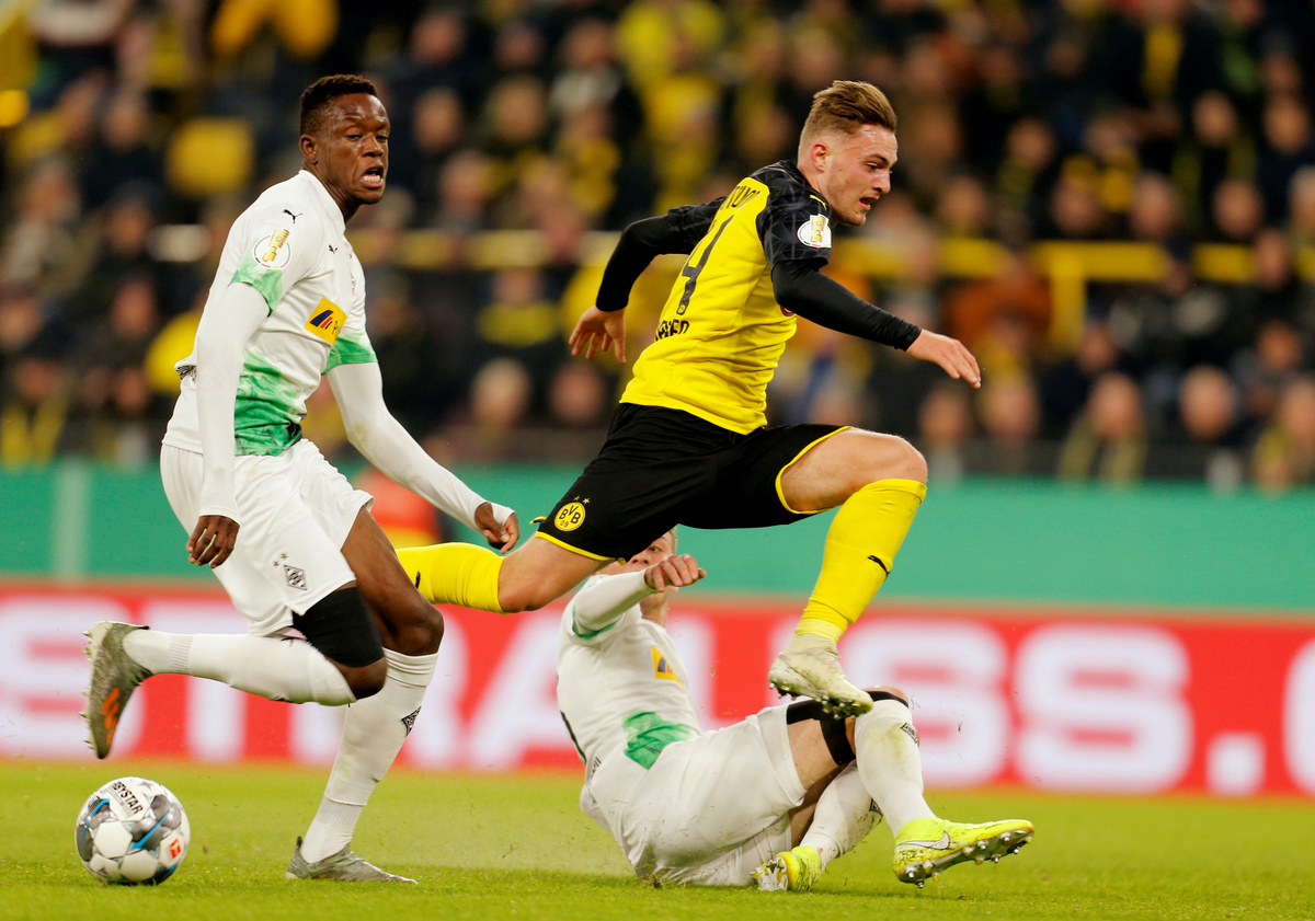 Soccer Football - DFB Cup - Second Round - Borussia Dortmund v Borussia Moenchengladbach - Signal Iduna Park, Dortmund, Germany - October 30, 2019 Borussia Dortmund's Axel Witsel in action with Borussia Moenchengladbach's Marcus Thuram and Jonas Hofmann REUTERS/Leon Kuegeler Soccer Football - DFB Cup - Second Round - Borussia Dortmund v Borussia Moenchengladbach - Signal Iduna Park, Dortmund, Germany - October 30, 2019 Borussia Dortmund's Dan Axel Zagadou in action with Borussia Moenchengladbach's Marcus Thuram REUTERS/Leon Kuegeler DFB regulations prohibit any use of photographs as image sequences and/or quasi-videoSoccer Football - DFB Cup - Second Round - Borussia Dortmund v Borussia Moenchengladbach - Signal Iduna Park, Dortmund, Germany - October 30, 2019 Borussia Dortmund's Jacob Bruun Larsen in action with Borussia Moenchengladbach's Louis Beyer and Denis Zakaria REUTERS/Leon Kuegeler Soccer Football - DFB Cup - Second Round - Borussia Dortmund v Borussia Moenchengladbach - Signal Iduna Park, Dortmund, Germany - October 30, 2019 Borussia Dortmund coach Lucien Favre before the match REUTERS/Leon Kuegeler