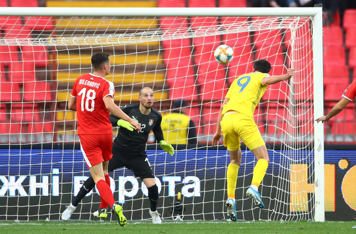 Soccer Football - Euro 2020 Qualifier - Group B - Serbia v Ukraine - Rajko Mitic Stadium, Belgrade, Serbia - November 17, 2019 Ukraine's Roman Yaremchuk scores their first goal REUTERS/Marko Djurica