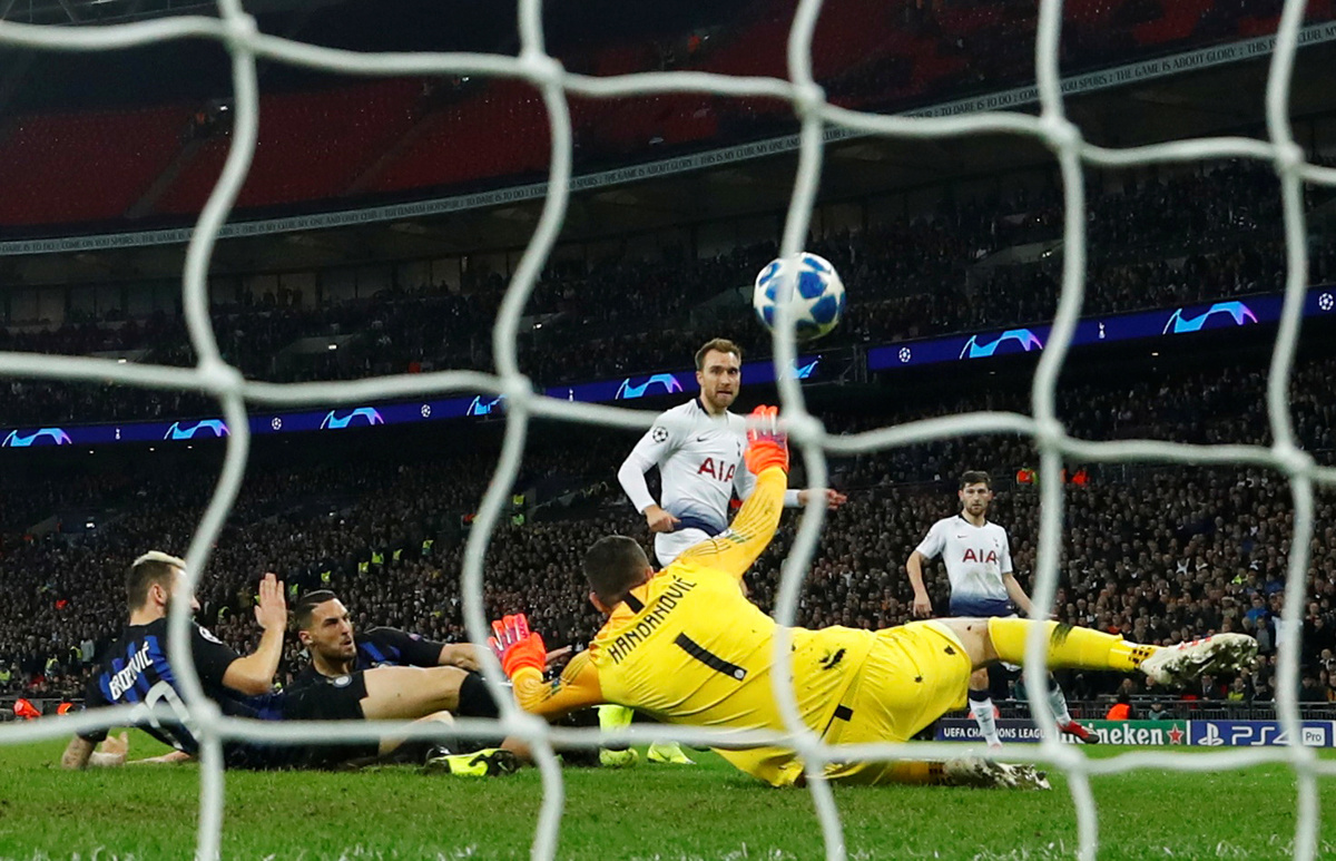 Inter, needing just a draw to reach the knockout rounds at Tottenham's expense, were holding firm until substitute Eriksen smashed home his side's winner in the 80th minute after superb work from midfield powerhouse Moussa Sissoko.