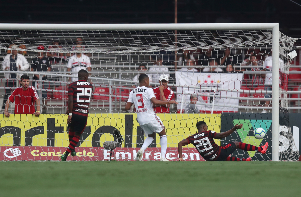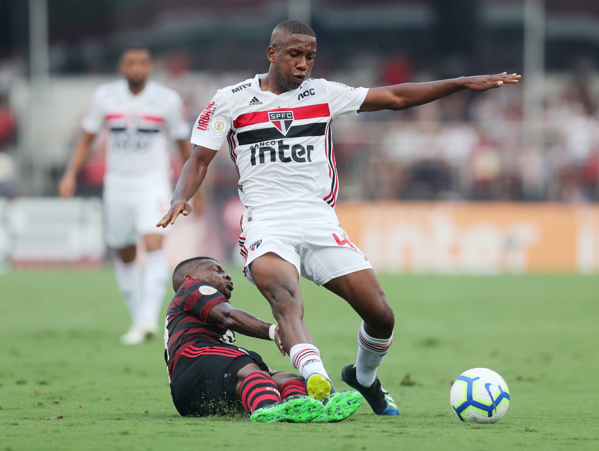 Soccer Football - Brasileiro Championship - Sao Paulo v Flamengo - Morumbi Stadium, Sao Paulo, Brazil - May 5, 2019 Sao Paulo’s Jonas Toro in action with Flamengo's Lincoln REUTERS/Amanda Perobelli