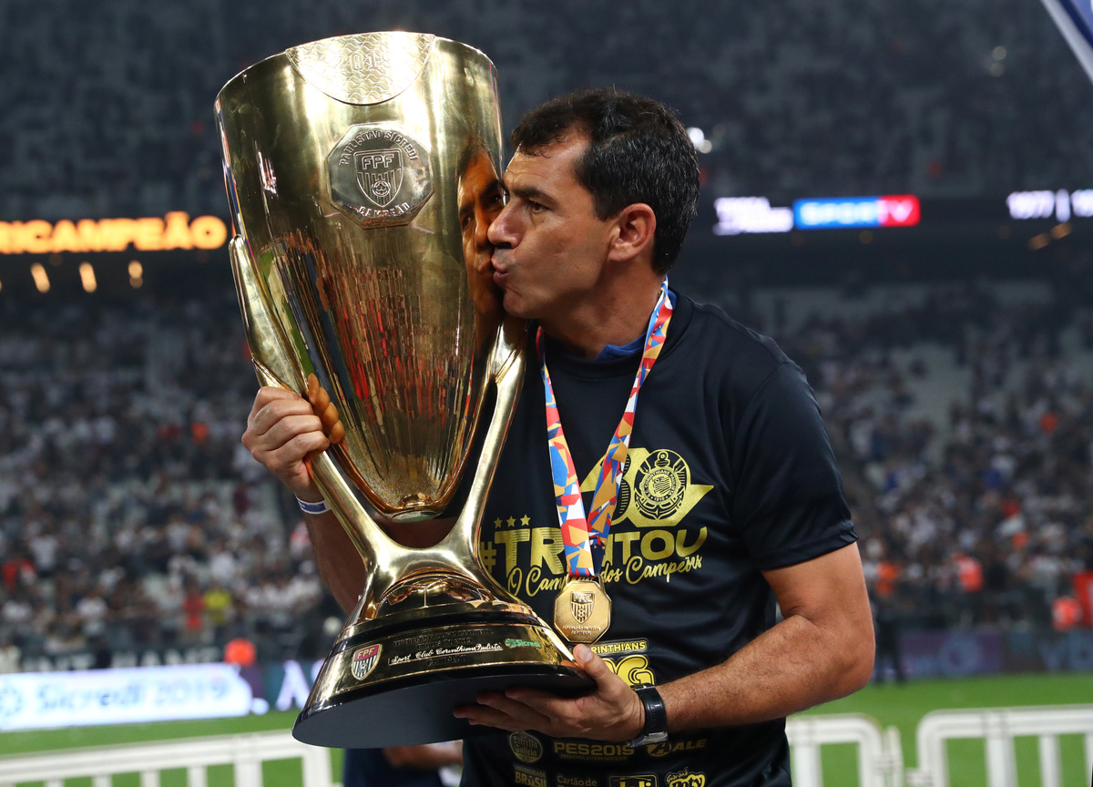 Paulista Championship - Final - Corinthians v Sao Paulo - Arena Corinthians, Sao Paulo, Brazil - April 21, 2019 Corinthians coach Fabio Carille celebrates with the trophy REUTERS/Amanda Perobelli
