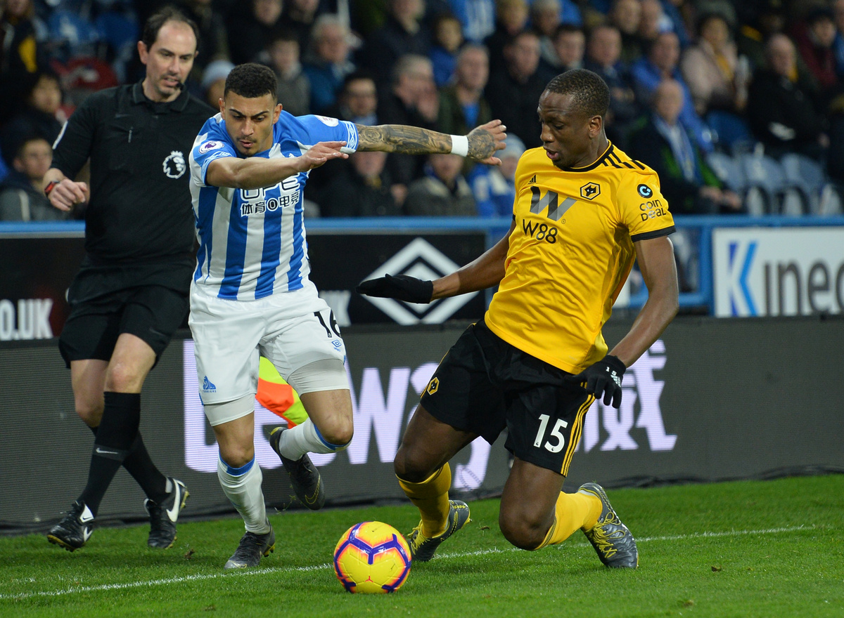 Soccer Football - Premier League - Huddersfield Town v Wolverhampton Wanderers - John Smith's Stadium, Huddersfield, Britain - February 26, 2019 Wolverhampton Wanderers' Leander Dendoncker in action with Huddersfield Town's Steve Mounie Action Images via Reuters/Jason Cairnduff